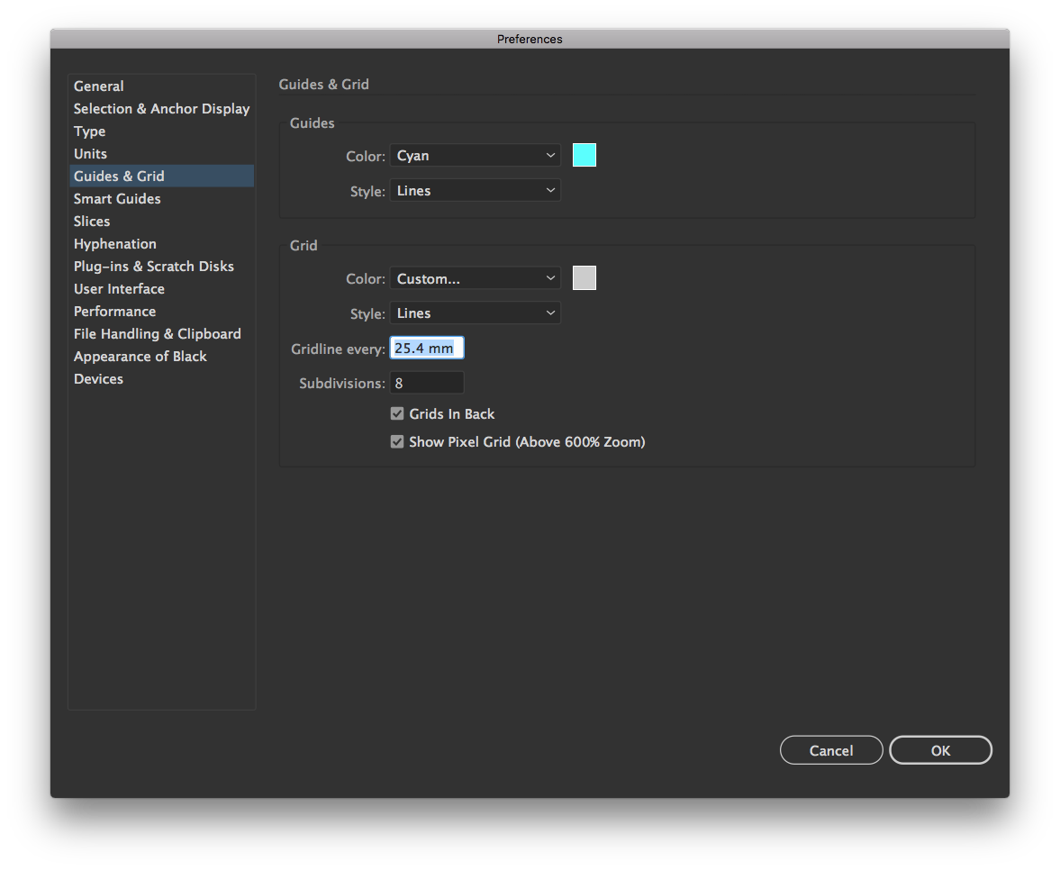 • 맥 : Illustrator > Preferences > Guides & Grid